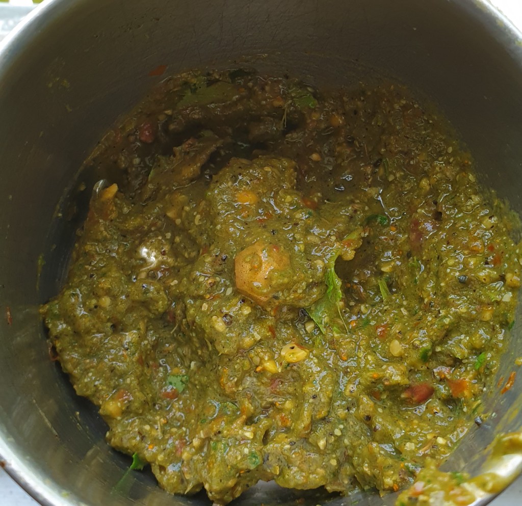- Add garlic,chopped tomato, pepper, cumin, curry leaves and coriander leaves to it and make it to a paste