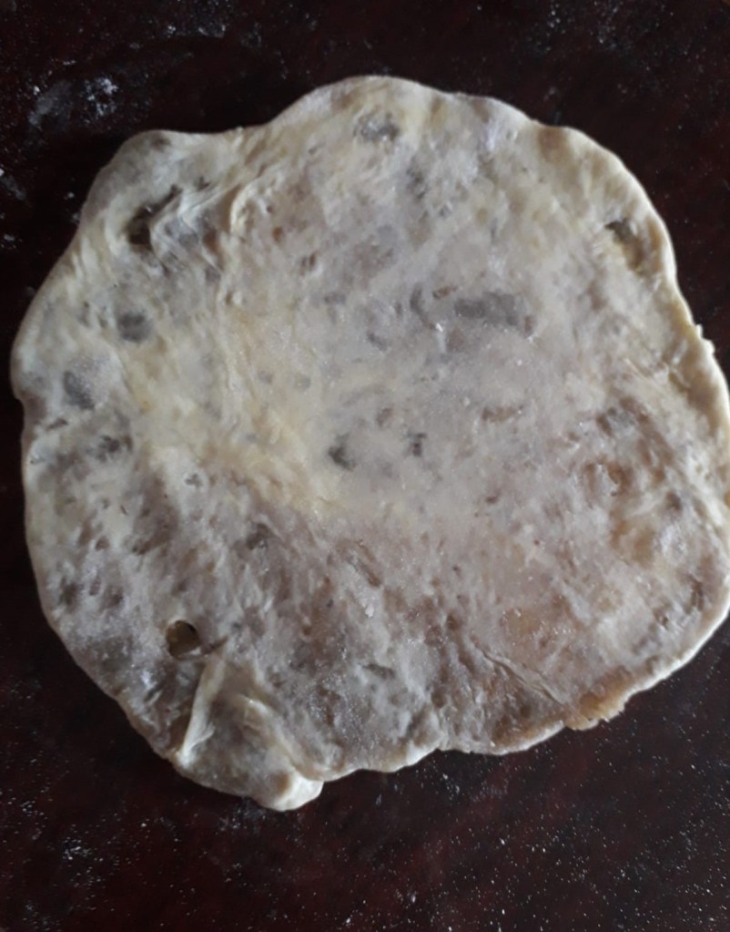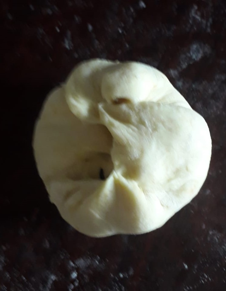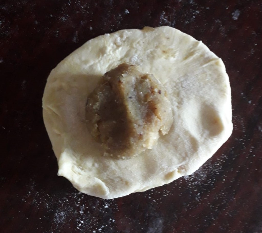 - Make balls from maida dough and flatten it thick, keep the stuffing inside and cover it